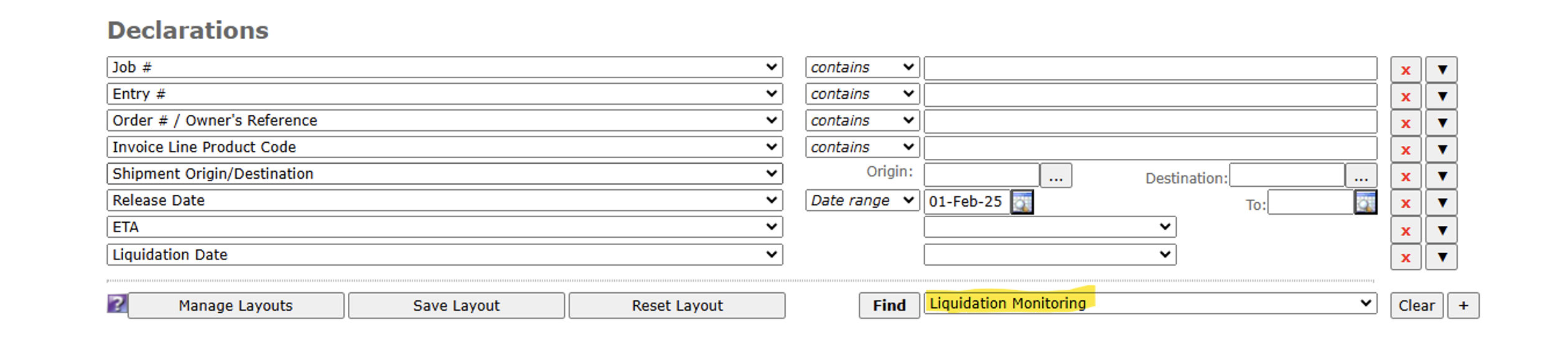 - Entry number, line number, entry date, scheduled liquidation Friday, current status (unliquidated/extended/suspended/liquidated)
